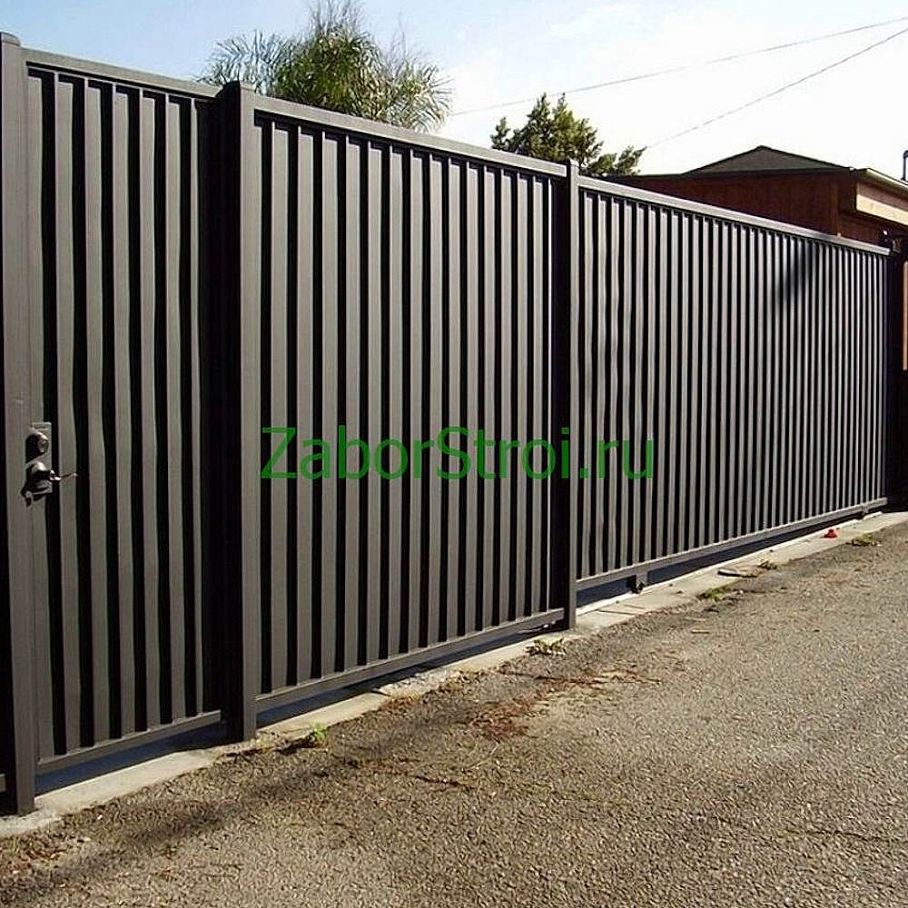 Откатные ворота из профнастила с встроенной калиткой